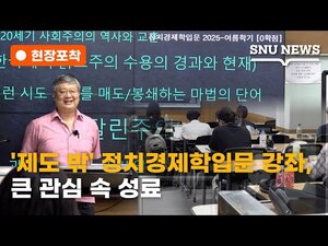 현장의 생생함을 담습니다, [현장포착]은 세상의 있는 그대로의 모습을 카메라에 담아낸 현장 영상 시리즈입니다. 지난 7일(목) 오후 2시 사회과학관(16동) 110호에서 여름학기 ‘정치경제학입문’ 강의 마지막 수업이 열렸습니다. '제도 밖' 강의의 진행 모습과 수강생들의 생생한 인터뷰가 궁금하다면? [현장포착] 정치경제학입문 편에서 확인하세요!