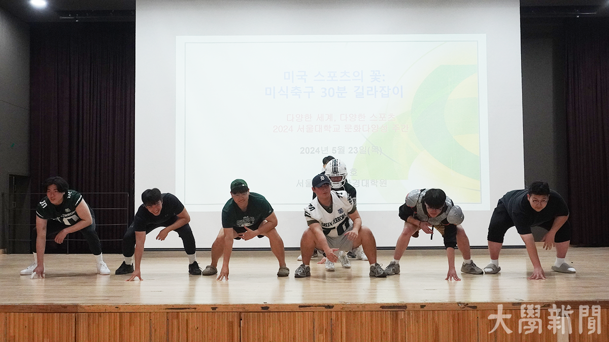 기자는 23일 오전에 열린 미식축구 소개 행사에 다녀왔다. 이날 진행을 맡은 홍종호 교수(환경계획학과)는 서울대 미식축구부 지도 교수일 뿐만 아니라, 미식축구 해설위원을 맡기도 한 특별한 경력의 소유자다. 홍 교수는 미식축구에 대한 각별한 애정을 드러내며 미식축구의 규칙과 전략, 역사 등에 대한 폭넓은 지식을 전했다. 이날 행사에는 서울대 미식축구부 ‘GREEN TERRORS’의 선수들도 참석해 직접 단상 위로 올라와 팀을 소개하고 장비 착용법을 선보이기도 했다.