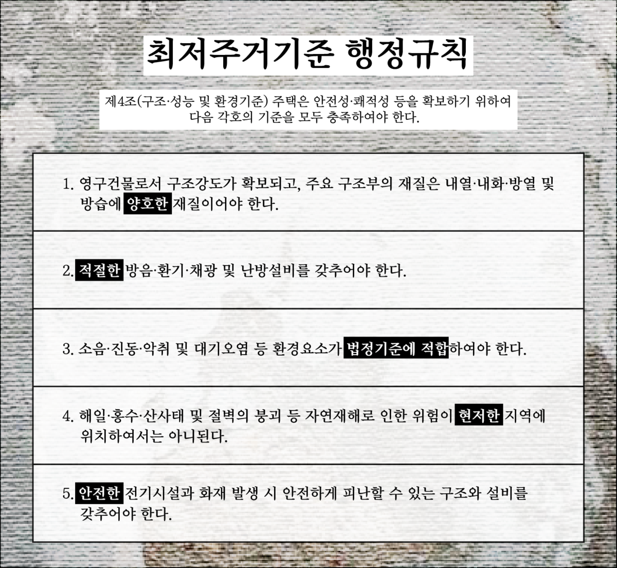 이처럼 열악한 주거가 사라지지 않는 문제의 근본적인 원인은 불완전한 현행 카지노주거기준에 있다. 탁장한 강사(사회복지학과)는 “본래 카지노주거기준은 주거 취약 계층을 보호하고 주거 환경의 불평등을 완화하기 위해 존재하나 제 역할을 다하지 못하고 있다”라고 이를 지적했다. 카지노주거기준이란 국민이 쾌적하고 살기 좋은 생활을 영위하기 위해 필요한 최소한의 주거수준으로, ‘주거기본법’에 의거하며 실질적인 세부 기준은 별도 행정규칙으로 정한다. 행정규칙 상 기준은 크게 △최소 주거 면적 및 용도별 방의 개수 △필수 설비 △구조‧성능 및 환경 기준의 세 항목과 항목별 세부 지침들로 구성된다. 그러나 각 항목은 저마다의 내용상 결점으로 비판받는 실정이다. 특히 마지막 항목은 방습‧환기‧채광 등 ‘쾌적하고 살기 좋은’ 실내 환경의 보장과 밀접하게 연관된 요소를 규정하고 있음에도 적절한 제한 기준을 제시하지 못하고 있어 지적의 대상이 되고 있다.