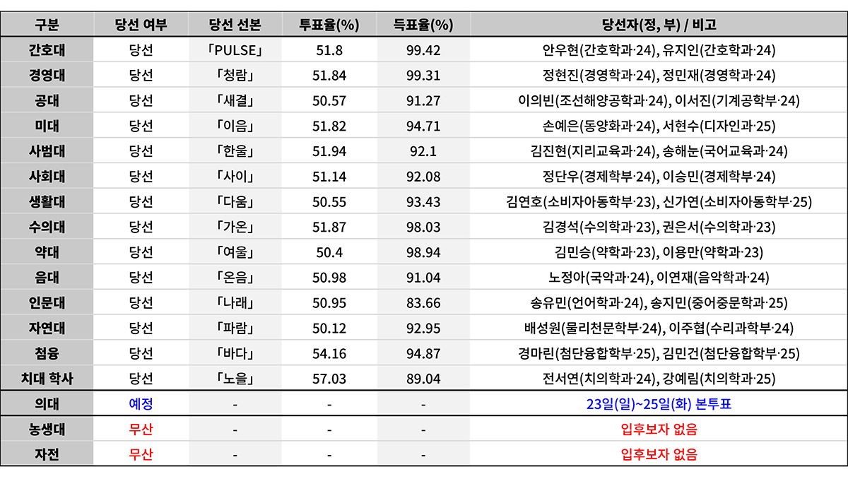 당선 선본은 △간호대 「PULSE」 △경영대 「청람」 △공대 「새결」 △미대 「이음」 △사범대 「한울」 △사회대 「사이」 △생활대 「다움」 △수의대 「가온」 △약대 「여울」 △음대 「온음」 △인문대 「나래」 △자연대 「파람」 △첨단융합학부 「바다」 △치대 학사과정 「노을」로, 당선 선본 모두 단일 선본으로 출마했다. 농생대와 자유전공학부는 ‘입후보자 없음’으로 선거가 무산됐다.